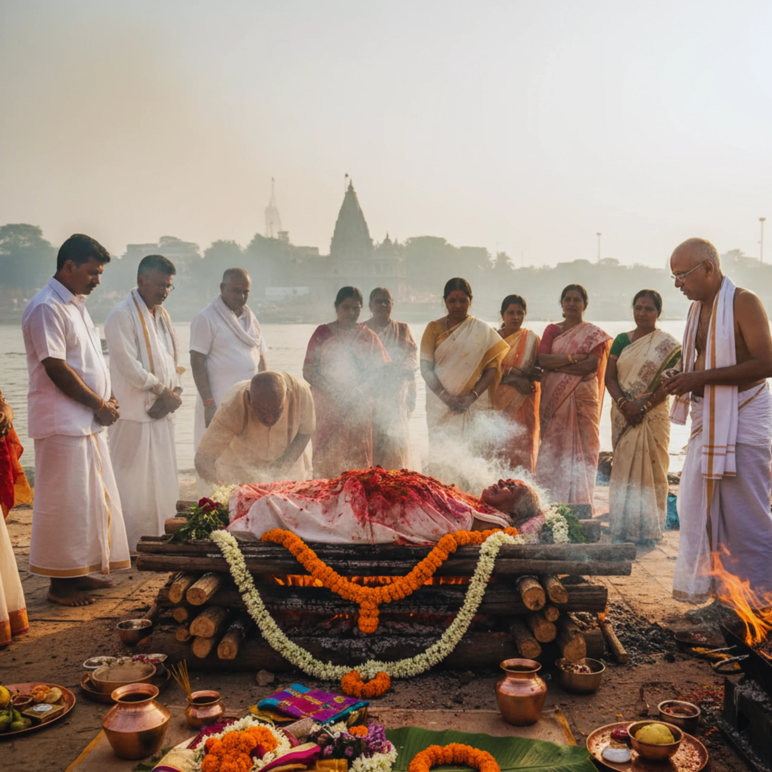 During the funeral, our priest first inspects all the puja materials and arranges them in order. The bamboo bier on which the body is placed is carefully prepared. After this, the family members bathe the body for purification. If bathing is not possible, the body should be thoroughly wiped with a cotton cloth and lukewarm water. A paste of sandalwood powder is then prepared and applied to the deceased. After this is completed, the body is laid on a mat, ensuring that the head is facing north and the feet are facing south. Dress the deceased in beautiful clothes. Place Ganga water and basil leaves in the mouth. Once this is complete, the body is taken and laid on the bamboo bier and tied tightly with ropes. After the priest chants peace and prayer mantras, all family members and other guests present offer flowers and garlands to the body and pray to God for the soul’s peace and salvation. The final journey begins with the Gayatri Mantra.